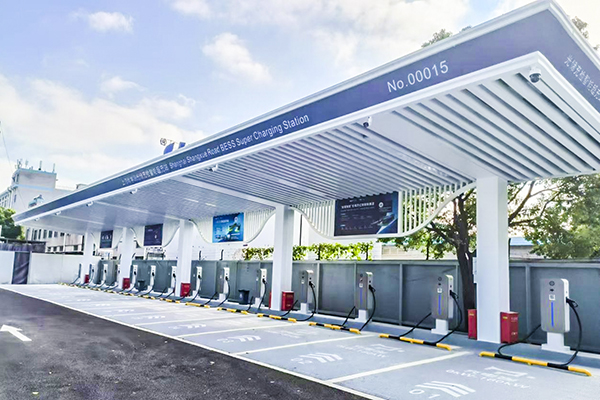 作为城市分布式储能的示范应用案例,上海尚学路光储充检超级充电站配备了127.6kWp分布式光伏板、3296kWh的储能系统,光伏发电系统能够结合储能系统、充电系统,实现光、储、充协调运用,提升清洁能源的消纳利用。场站的储能系统还可以在谷电时段优先储存市网价优的电能,并在用电峰值时段供充电使用,减轻高峰时段的电网负荷、实现削峰填谷,既降低充电成本让利车主,又提升了自身的运营收益,保障场站长期稳定运营。由于采用了全直流微网技术,超充站自身相当于一个微电网,即便多台车辆高功率同时充电,也不会对公共电网造成供电负荷,甚至利用储能系统还能够参与系统调频、调压,改善电能质量,通过储充技术结合的运用,进一步缓解城市中心区充电基础设施增容、扩容的压力。