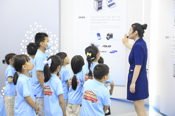 宣传片观看结束后,孩子们最期待的展厅探秘环节正式开始。在讲解员和志愿者的带领下,孩子们步入了展厅,沉浸式感受科技的魅力。讲解员用生动易懂的语言,结合香港大学志愿者们的实物操作演示,将复杂的锂电池检测技术、新能源汽车充电技术讲述得妙趣横生、直白易懂。孩子们兴致勃勃,认真聆听讲解。